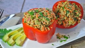 Preberi večSestavine ( za dve osebi): 2 papriki Nadev: 150 g korenja 240 g bučk 110 g stebelne zelene 70 g rdeče paprike 220 g paradižnika brez semen in vode 12 g orehov 1 žlica drobnjaka, nasekljanega 0,5 žlice peteršilja, nasekljanega Omaka: 250 g paradižnika 300 g paradižnika, narezanega na kolesca ali pol skodelice suhih paradižnikov…